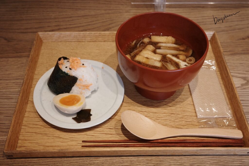 點餐非常乾脆,一人就是一個套餐,內含一顆飯糰、半顆溏心蛋、幾片醃漬小菜和一碗味增湯,我點了鮭魚三角飯糰,飯體就是大家最愛的日本飯!鮭魚也不會過鹹,跟海苔還有米飯搭配的很好,溏心蛋的醬油味也很香,唯一就是日式味增湯真的有比較鹹😂